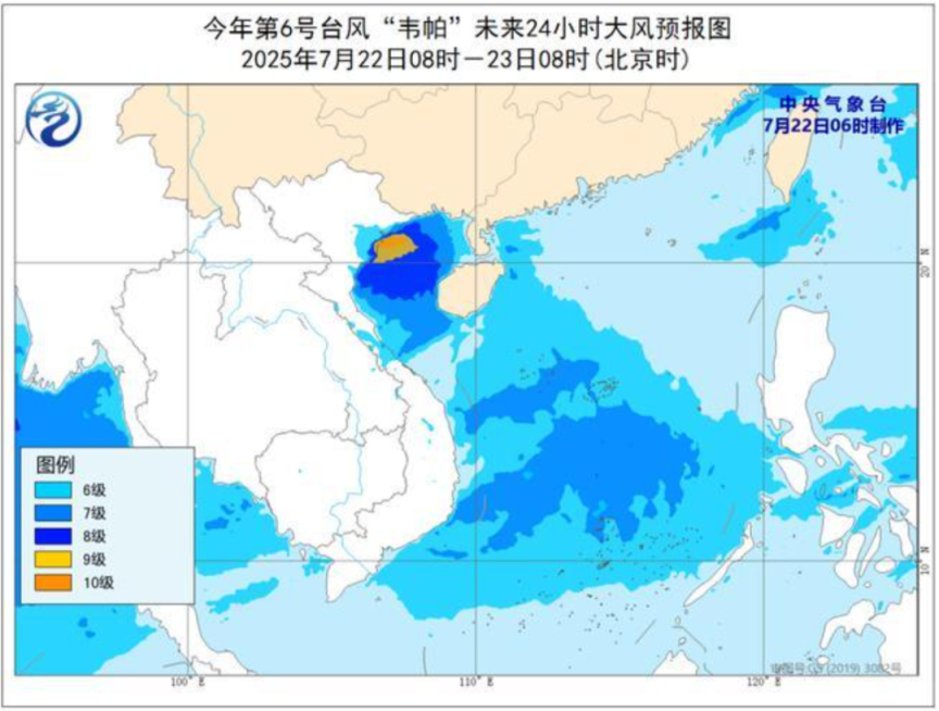 大风预报:7月22日08时至23日08时,受“韦帕”和西南季风的共同影响,南海大部、北部湾、琼州海峡、西沙群岛、中沙群岛、南沙群岛以及海南岛沿海、广东西南部沿海、广西沿海等地将有6~7级风,阵风8~9级,其中北部湾、广西沿海、海南岛西部沿海的风力可达8~9级,阵风10~11级,北部湾部分海域风力有10级,阵风11~12级。